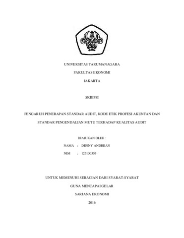 Andrean, Denny (2017) Pengaruh penerapan standar audit, kode etik profesi akuntan dan standar pengendalian mutu terhadap kualitas audit / Denny Andrean. Skripsi thesis, Universitas Tarumanagara.