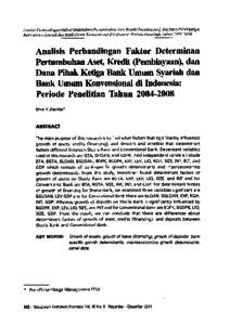 The main purpose of this research is to find what factors that significantly influencesgrowth of assets, credits (financing), and deposits and whether that determinantfactors different between Sharia Bank and Conventional Bank. Dependent variablesused in this research are GTA, GLOAN, and GDPK. And independent variable includeBTA, BGTA, BLOAN, BGLOAN, BDPK, BGDPK, EXP, LEV, LIQ, ROA, SIZE, INF, INT, andGDP which contain of bank-specific growth determinants and macroeconomicsgrowth determinants. From this study, researcher found determinant factors ofgro.wth of assets on Sharia Bank are BGTA, EXP, LEV, LIQ, SIZE, and INT and forConventional Bank are BTA, BGTA, SIZE, INF, INT, and GDP. For determinant factorsof growth of financing for Sharia Bank, we examined three variables significant areBG LOAN, LEV GDP and for Conventional Bank there are BLOAN, BG LOAN, EXP, ROA,INT, GDP. Whereas growth of deposits on Sharia Bank is significantly influenced byBGDPK, EXP, LEV, LIQ, SIZE, and INT and for Conventional Bank are BDPK, BGDPK, LIQ,SIZE, GDP. From the result, we can conclude that there are differences aboutdeterminant factors of growth of asset, credits (financing), and deposits betweenSharia Bank and Conventional Bank.