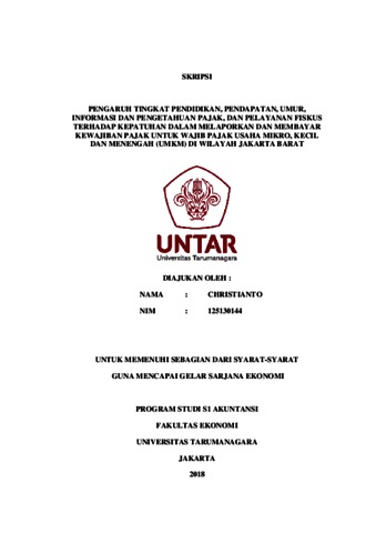 Christianto, Christianto (2018) PENGARUH TINGKAT PENDIDIKAN, PENDAPATAN, UMUR, INFORMASI DAN PENGETAHUAN PAJAK, DAN PELAYANAN FISKUS TERHADAP KEPATUHAN DALAM MELAPORKAN DAN MEMBAYAR KEWAJIBAN PAJAK UNTUK WAJIB PAJAK USAHA MIKRO, KECIL DAN MENENGAH (UMKM) DI WILAYAH JAKARTA BARAT. Skripsi thesis, Universitas Tarumanagara.