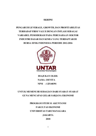 Devita, Devita (2018) PENGARUH LEVERAGE, GROWTH, DAN PROFITABILITAS TERHADAP FIRM VALUE DENGAN INFLASI SEBAGAI VARIABEL PEMODERASI PADA PERUSAHAAN SEKTOR INDUSTRI DASAR DAN KIMIA YANG TERDAFTAR DI BURSA EFEK INDONESIA PERIODE 2012-2016. Skripsi thesis, Universitas Tarumanagara.