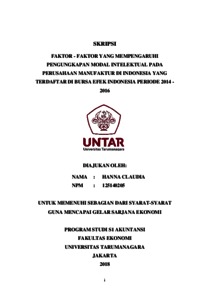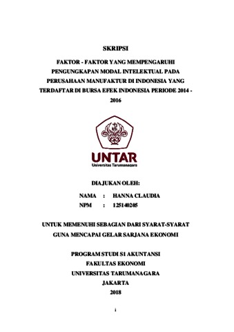 Claudia, Hanna (2018) FAKTOR - FAKTOR YANG MEMPENGARUHI PENGUNGKAPAN MODAL INTELEKTUAL PADA PERUSAHAAN MANUFAKTUR DI INDONESIA YANG TERDAFTAR DI BURSA EFEK INDONESIA PERIODE 2014 - 2016. Skripsi thesis, Universitas Tarumanagara.