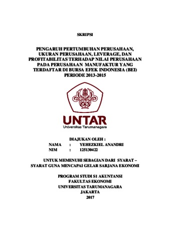 Anandri, Yehezkiel (2017) Pengaruh pertumbuhan perusahaan, ukuran perusahaan, leverage dan profitabilitas terhadap nilai perusahaan pada perusahaan manufaktur yang terdaftar di Bursa Efek Indonesia (BEI) Periode 2013-2015 / Yehezkiel Anandri. Skripsi thesis, UNIVERSITAS TARUMANEGARA.