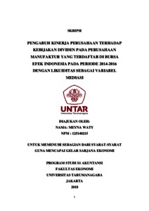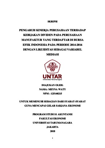 Waty, Meyna (2018) PENGARUH KINERJA PERUSAHAAN TERHADAP KEBIJAKAN DIVIDEN PADA PERUSAHAAN MANUFAKTUR YANG TERDAFTAR DI BURSA EFEK INDONESIA PADA PERIODE 2014-2016 DENGAN LIKUIDITAS SEBAGAI VARIABEL MEDIASI. Skripsi thesis, Universitas Tarumanagara.