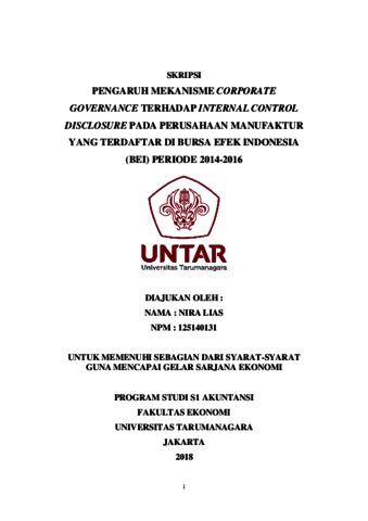 Lias, Nira (2018) PENGARUH MEKANISME CORPORATE GOVERNANCE TERHADAP INTERNAL CONTROL DISCLOSURE PADA PERUSAHAAN MANUFAKTUR YANG TERDAFTAR DI BURSA EFEK INDONESIA (BEI) PERIODE 2014-2016. Skripsi thesis, Universitas Tarumanagara.