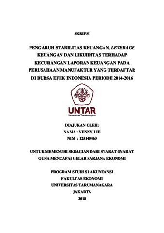 Lie, Venny (2018) PENGARUH STABILITAS KEUANGAN, LEVERAGE KEUANGAN, DAN LIKUIDITAS TERHADAP KECURANGAN LAPORAN KEUANGAN PADA PERUSAHAAN MANUFAKTUR YANG TERDAFTAR DI BURSA EFEK INDONESIA PERIODE 2014-2016. Skripsi thesis, Universitas Tarumanagara.