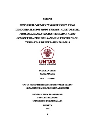 Vinasia, Vinasia (2018) PENGARUH CORPORATE GOVERNANCE YANG DIMODERASI AUDIT MODE CHANGE, AUDITOR SIZE, FIRM SIZE, DAN LEVERAGE TERHADAP AUDIT EFFORT PADA PERUSAHAAN MANUFAKTUR YANG TERDAFTAR DI BEI TAHUN 2010-2016. Skripsi thesis, Universitas Tarumanagara.