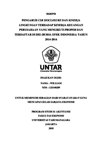 William, William (2018) PENGARUH CSR DISCLOSURE DAN KINERJA LINGKUNGAN TERHADAP KINERJA KEUANGAN PERUSAHAAN YANG MENGIKUTI PROPER DAN TERDAFTAR DI BEI (BURSA EFEK INDONESIA) TAHUN 2014-2016. Skripsi thesis, Universitas Tarumanagara.