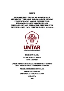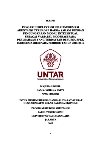 Anita, Yohana (2017) PENGARUH RELEVANSI NILAI INFORMASI AKUNTANSI TERHADAP HARGA SAHAM DENGAN PENGUNGKAPAN MODAL INTELEKTUAL SEBAGAI VARIABEL MODERASI PADA PERUSAHAAN YANG TERDAFTAR DI BURSA EFEK INDONESIA (BEI) PADA PERIODE TAHUN 2015-2016. Skripsi thesis, Universitas Tarumanagara.