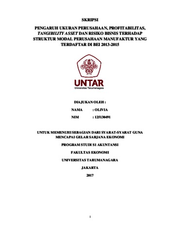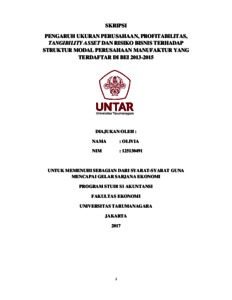 Olivia, Olivia (2017) Pengaruh ukuran perusahaan, profitabilitas, tangibility asset dan risiko bisnis terhadap struktur modal perusahaan manufaktur yang terdaftar di BEI 2013-2015 / Olivia. Skripsi thesis, UNIVERSITAS TARUMANEGARA.
