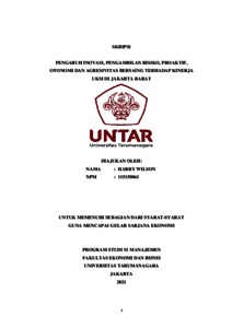 WILSON, HARRY (2021) PENGARUH INOVASI, PENGAMBILAN RISIKO, PROAKTIF, OTONOMI DAN AGRESIVITAS BERSAING TERHADAP KINERJA UKM DI JAKARTA BARAT. Skripsi thesis, Universitas Tarumanagara.