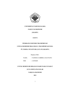 Kaunang, Vanessa Gabriela (2011) PENERAPAN METODE TRANSPORTASI UNTUK MEMINIMUMKAN BIAYA TRANSPORTASI PADA PT. MARGA NUSANTARA JAYA DI JAKARTA. Skripsi thesis, Universitas Tarumanagara.