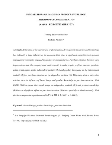 Ruslim, Tommy Setiawan and Andrew, Richard (2012) PENGARUH BRAND IMAGE DAN PRODUCT KNOWLEDGE TERHADAP PURCHASE INTENTION (KASUS : KOSMETIK MERK “X”). Karya Ilmiah Dosen.