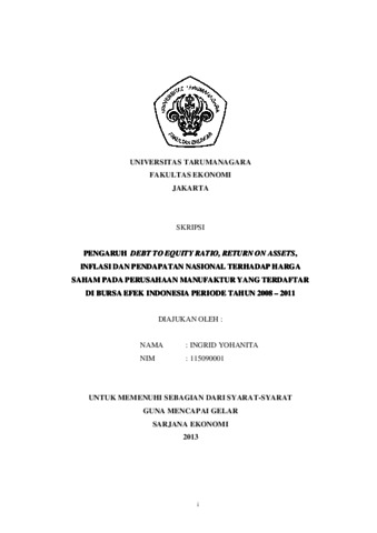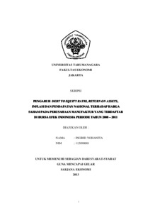 Yohanita, Ingrid (2013) PENGARUH DEBT TO EQUITY RATIO, RETURN ON ASSETS, INFLASI DAN PENDAPATAN NASIONAL TERHADAP HARGA SAHAM PADA PERUSAHAAN MANUFAKTUR YANG TERDAFTAR DI BURSA EFEK INDONESIA PERIODE TAHUN 2008 – 2011. Skripsi thesis, Universitas Tarumanagara.