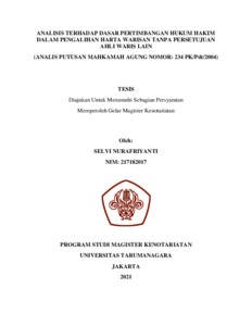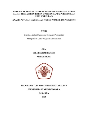 Nurafriyanti, Selfi (2021) Analisis Terhadap Dasar Pertimbangan Hukum Hakim Dalam Pengalihan Harta Warisan Tanpa Persetujuan Ahli Waris Lain (Analisis Putusan Mahkamah Agung Nomor: 234/PK/PDT/2004). Masters thesis, Universitas Tarumanagara.