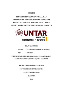 DARRYL, ALLOYSIUS GONZAGA (2020) PENGARUH DUKUNGAN SOSIAL DAN KEMAMPUAN KEWIRAUSAHAAN TERHADAP PERILAKU KEWIRAUSAHAAN PADA USAHA MIKRO KECIL MENENGAH (UMKM) DI JAKARTA. Skripsi thesis, Universitas Tarumanagara.