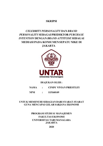 PRIESTLEY, CINDY VIVIAN (2020) CELEBRITY PERSONALITY DAN BRAND PERSONALITY SEBAGAI PREDIKTOR PURCHASE INTENTION DENGAN BRAND ATTITUDE SEBAGAI MEDIASI PADA KONSUMEN SEPATU NIKE DI JAKARTA. Skripsi thesis, Universitas Tarumanagara.