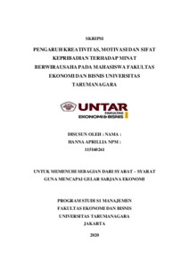 APRILLIA, HANNA (2020) PENGARUH KREATIVITAS, MOTIVASI DAN SIFAT KEPRIBADIAN TERHADAP MINAT BERWIRAUSAHA PADA MAHASISWA FAKULTAS EKONOMI DAN BISNIS UNIVERSITAS TARUMANAGARA. Skripsi thesis, Universitas Tarumanagara.