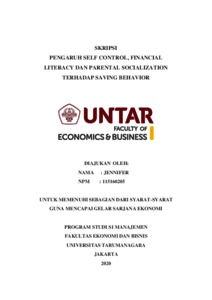 JENNIFER, JENNIFER (2020) PENGARUH SELF CONTROL, FINANCIAL LITERACY DAN PARENTAL SOCIALIZATION TERHADAP SAVING BEHAVIOR. Skripsi thesis, Universitas Tarumanagara.