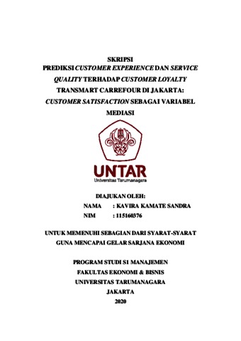 SANDRA, KAVIRA KAMATE (2020) PREDIKSI CUSTOMER EXPERIENCE DAN SERVICE QUALITY TERHADAP CUSTOMER LOYALTY TRANSMART CARREFOUR DI JAKARTA: CUSTOMER SATISFACTION SEBAGAI VARIABEL MEDIASI. Skripsi thesis, Universitas Tarumanagara.