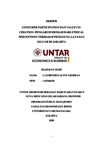 LEOFRAN, LAURENSIUS ALVIN (2020) CONSUMER PARTICIPATION DAN VALUE CO-CREATION: PENGARUH MEDIASI DARI ETHICAL PERCEPTIONS TERHADAP PENGGUNA LAYANAN GO-CAR DI JAKARTA. Skripsi thesis, Universitas Tarumanagara.