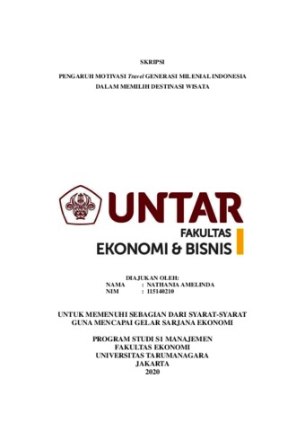AMELINDA, NATHANIA (2020) PENGARUH MOTIVASI Travel GENERASI MILENIAL INDONESIA DALAM MEMILIH DESTINASI WISATA. Skripsi thesis, Universitas Tarumanagara.