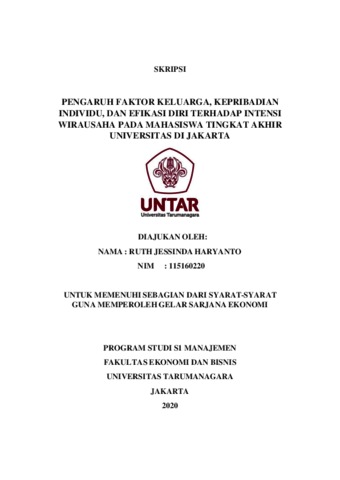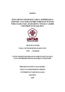 HARYANTO, RUTH JESSINDA (2020) PENGARUH FAKTOR KELUARGA, KEPRIBADIAN INDIVIDU, DAN EFIKASI DIRI TERHADAP INTENSI WIRAUSAHA PADA MAHASISWA TINGKAT AKHIR UNIVERSITAS DI JAKARTA. Skripsi thesis, Universitas Tarumanagara.