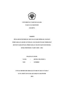 Fransisca, Jenisa (2014) PENGARUH INFORMASI ARUS KAS DARI OPERASI, UKURAN PERUSAHAAN, RASIO LEVERAGE, DAN RASIO PASAR TERHADAP RETURN SAHAM PADA PERUSAHAAN MANUFAKTUR DI BURSA EFEK INDONESIA TAHUN 2010 – 2012. Skripsi thesis, UNIVERSITAS TARUMANAGARA.