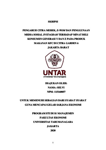 SELVI, SELVI (2020) PENGARUH CITRA MEREK, E-WOM DAN PENGGUNAAN MEDIA SOSIAL INSTAGRAM TERHADAP MINAT BELI KONSUMEN GENERASI Y DAN Z PADA PRODUK MAKANAN KFC DI CITRA GARDEN 6 JAKARTA BARAT. Skripsi thesis, Universitas Tarumanagara.