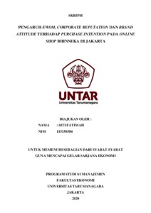FATIMAH, SITI (2020) PENGARUH EWOM, CORPORATE REPUTATION DAN BRAND ATTITUDE TERHADAP PURCHASE INTENTION PADA ONLINE SHOP BHINNEKA DI JAKARTA. Skripsi thesis, Universitas Tarumanagara.
