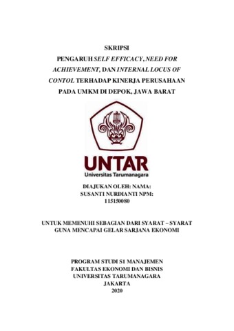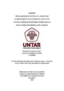 NURDIANTI, SUSANTI (2020) PENGARUH SELF EFFICACY, NEED FOR ACHIEVEMENT, DAN INTERNAL LOCUS OF CONTOL TERHADAP KINERJA PERUSAHAAN PADA UMKM DI DEPOK, JAWA BARAT. Skripsi thesis, Universitas Tarumanagara.
