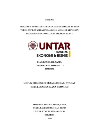 NISSI, THEOFILUS EL (2020) PENGARUH KUALITAS MAKANAN DAN KUALITAS LAYANAN TERHADAP LOYALITAS PELANGGAN MELALUI KEPUASAN PELANGGAN MCDONALDS DI JAKARTA BARAT. Skripsi thesis, Universitas Tarumanagara.