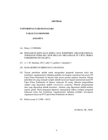 Henry, Henry (2014) PENGARUH KEPUASAN KERJA DAN KOMITMEN ORGANISASIONAL TERHADAP PERILAKU KEWARGAAN ORGANISASI PT CIPTA PRIMA PARKIRINDO DI JAKARTA. Skripsi thesis, Universitas Tarumanagara.