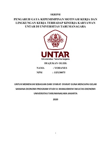 YOHANES, YOHANES (2020) PENGARUH GAYA KEPEMIMPINAN MOTIVASI KERJA DAN LINGKUNGAN KERJA TERHADAP KINERJA KARYAWAN UNTAR DI UNIVERSITAS TARUMANAGARA. Skripsi thesis, Universitas Tarumanagara.