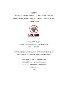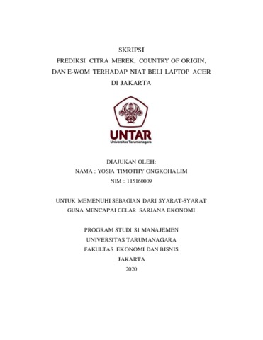 ONGKOHALIM, YOSIA TIMOTHY (2020) PREDIKSI CITRA MEREK, COUNTRY OF ORIGIN, DAN E-WOM TERHADAP NIAT BELI LAPTOP ACER DI JAKARTA. Skripsi thesis, Universitas Tarumanagara.