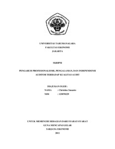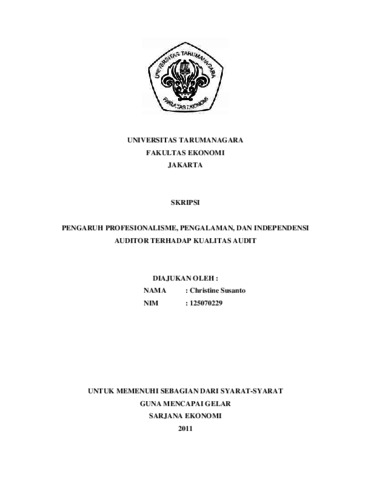 Susanto, Christine (2011) PENGARUH PROFESIONALISME, PENGALAMAN, DAN INDEPENDENSI AUDITOR TERHADAP KUALITAS AUDIT. Skripsi thesis, UNIVERSITAS TARUMANAGARA.