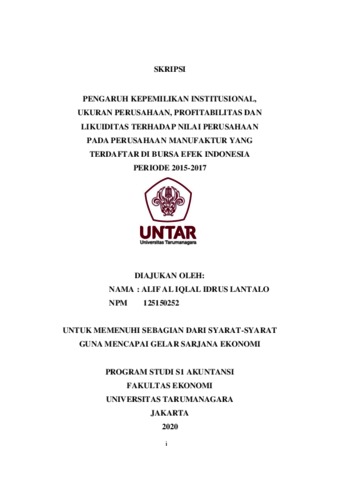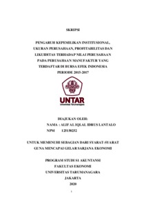 Lantalo, Alif Al Iqlal Idrus (2020) PENGARUH KEPEMILIKAN INSTITUSIONAL, UKURAN PERUSAHAAN, PROFITABILITAS, DAN LIKUIDITAS TERHADAP NILAI PERUSAHAAN YANG TERDAFTAR DI BURSA EFEK INDONESIA (BEI) PERIODE 2015-2017. Skripsi thesis, UNIVERSITAS TARUMANAGARA.