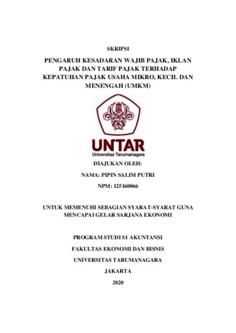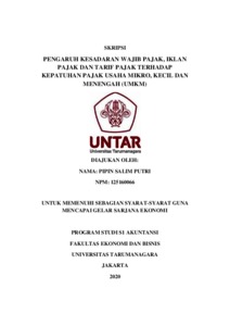 Putri, Pipin Salim (2020) PENGARUH KESADARAN WAJIB PAJAK, IKLAN PAJAK DAN TARIF PAJAK TERHADAP KEPATUHAN PAJAK USAHA MIKRO, KECIL DAN MENENGAH (UMKM). Skripsi thesis, UNIVERSITAS TARUMANAGARA.
