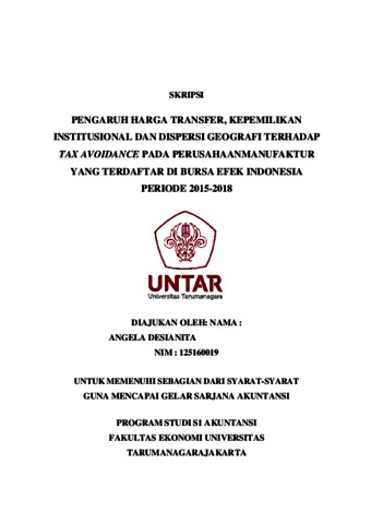 Desianita, Angela (2020) PENGARUH HARGA TRANSFER, KEPEMILIKAN INSTITUSIONAL DAN DISPERSI GEOGRAFI TERHADAP TAX AVOIDANCE PADA PERUSAHAAN MANUFAKTUR YANG TERDAFTAR DI BURSA EFEK INDONESIA PERIODE 2015-2018. Skripsi thesis, UNIVERSITAS TARUMANAGARA.