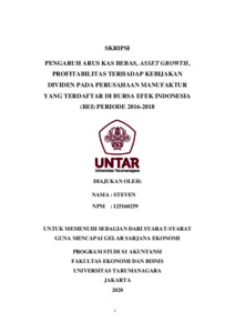 Steven, Steven (2020) PENGARUH ARUS KAS BEBAS, ASSET GROWTH DAN PROFITABILITAS TERHADAP KEBIJAKAN DIVIDEN PADA PERUSAHAAN MANUFAKTUR YANG TERDAFTAR DI BURSA EFEK INDONESIA (BEI) PADA PERIODE 2016-2018. Skripsi thesis, UNIVERSITAS TARUMANAGARA.