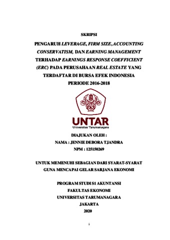 Tjandra, Jennie Debora (2020) PENGARUH LEVERAGE, FIRM SIZE, ACCOUNTING CONSERVATISM, DAN EARNINGS MANAGEMENT TERHADAP EARNINGS RESPONSE COEFFICIENT (ERC). Skripsi thesis, UNIVERSITAS TARUMANAGARA.
