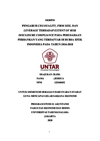 Jessica, Jessica (2020) PENGARUH CEO DUALITY, FIRM SIZE, DAN LEVERAGE TERHADAP EXTENT OF RISK DISCLOSURE COMPLIANCE PADA PERUSAHAAN PERBANKAN YANG TERDAFTAR DI BURSA EFEK INDONESIA PADA TAHUN 2016-2018. Skripsi thesis, UNIVERSITAS TARUMANAGARA.