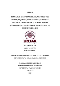 Devina, Devina (2020) PENGARUH ASSET TANGIBILITY, NON DEBT TAX SHIELD, LIQUIDITY, PROFITABILITY, FIRM SIZE, DAN GROWTH TERHADAP STRUKTUR MODAL PADA INDUSTRI MANUFAKTUR YANG LISTING DI BEI TAHUN 2016-2018. Skripsi thesis, UNIVERSITAS TARUMANAGARA.