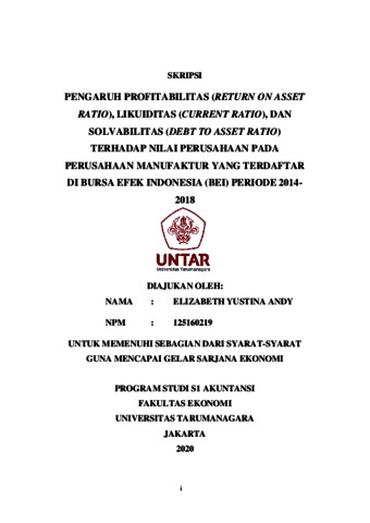 Andy, Elizabeth Yustina (2020) PENGARUH PROFITABILITAS (RETURN ON ASSET RATIO), LIKUIDITAS (CURRENT RATIO), DAN SOLVABILITAS (DEBT TO ASSET RATIO) PADA PERUSAHAAN MANUFAKTUR YANG TERDAFTAR DI BURSA EFEK INDONESIA (BEI) TAHUN 2014 – 2018. Skripsi thesis, UNIVERSITAS TARUMANAGARA.