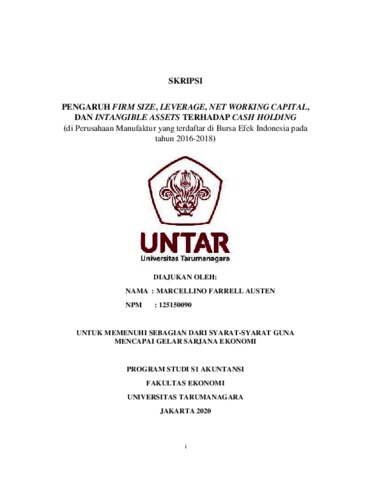 Austen, Marcellino Farrell (2020) Pengaruh Firm Size, Leverage, Net Working Capital, Dan Intangible Assets Terhadap Cash Holding (di Perusahaan Manufaktur yang terdaftar di Bursa Efek Indonesia pada tahun 2016-2018). Skripsi thesis, UNIVERSITAS TARUMANAGARA.