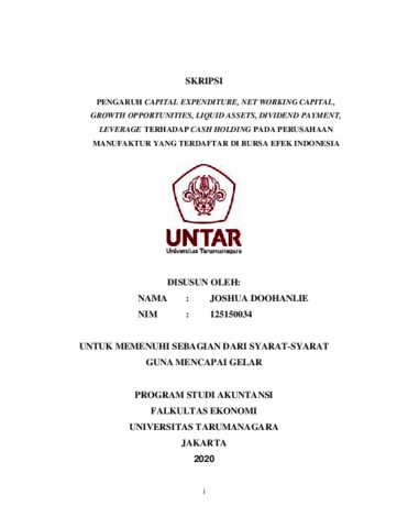 Doohanlie, Joshua (2020) Pengaruh Capital Expenditure, Net Working Capital, Growth Opportunities, Liquid Assets, Dividend Payment, Leverage Terhadap Cash Holding Pada Perusahaan Manufaktur Yang terdaftar Di Bursa Efek Indonesia. Skripsi thesis, UNIVERSITAS TARUMANAGARA.