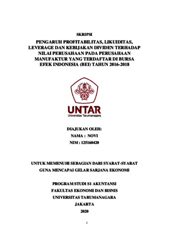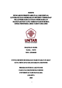 Novi, Novi (2020) PENGARUH PROFITABILITAS, LIKUIDITAS, LEVERAGE DAN KEBIJAKAN DIVIDEN TERHADAP NILAI PERUSAHAAN PADA PERUSAHAAN MANUFAKTUR YANG TERDAFTAR DI BURSA EFEK INDONESIA (BEI) TAHUN 2016-2018. Skripsi thesis, UNIVERSITAS TARUMANAGARA.