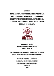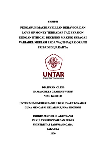 WISNU, GRETA GRAHENI (2020) PENGARUH MACHIAVELLIAN BEHAVIOR DAN LOVE OF MONEY TERHADAP TAX EVASION DENGAN ETHICAL DECISION MAKING SEBAGAI VARIABEL MEDIASI PADA WAJIB PAJAK ORANG PRIBADI DI JAKARTA. Skripsi thesis, Universitas Tarumanagara.