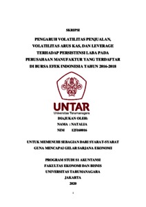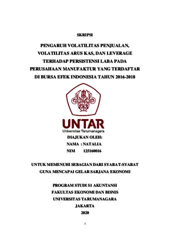 NATALIA, NATALIA (2020) PENGARUH VOLATILITAS PENJUALAN, VOLATILITAS ARUS KAS, DAN LEVERAGE TERHADAP PERSISTENSI LABA PADA PERUSAHAAN MANUFAKTUR YANG TERDAFTAR DI BURSA EFEK INDONESIA TAHUN 2016-2018. Skripsi thesis, Universitas Tarumanagara.