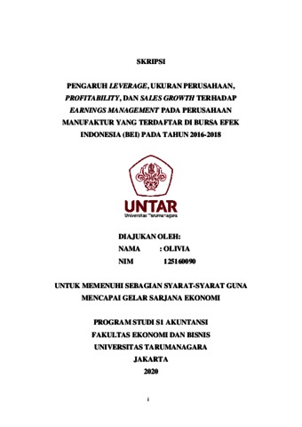 OLIVIA, OLIVIA (2020) PENGARUH LEVERAGE, UKURAN PERUSAHAAN, PROFITABILITY, DAN SALES GROWTH TERHADAP EARNINGS MANAGEMENT PADA PERUSAHAAN MANUFAKTUR YANG TERDAFTAR DI BURSA EFEK INDONESIA (BEI) PADA TAHUN 2016-2018. Skripsi thesis, Universitas Tarumanagara.