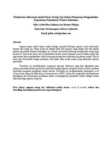 Segmen pasar untuk tujuan wisata terbagi menjadi beberapa segmen, yaitu anak-anak,dewasa dan orang tua. Pasar orang tua adalah salah satu segmen yang sangat kuat dan dipilihindustri pariwisata dekade belakangan ini. Industri pariwisata sekarang menargetkan orang yangberusia 65 tahun atau lebih, hal ini disebabkan karena secara finansial mereka sudah mapan daningin santai dan menghabiskan untuk bersenang-senang dan melakukan perjalanan wisata. Hal initentu saja berkorelasi dengan perhatian lebih pada iklan media massa yang dilakukan industripariwisata.Penelitian ini mendiskusikan mengenai tipe-tipe informasi yang bisa digunakan paraindustri pariwisata dalam pemberian informasi kepada segmen orang tua ketika mereka membuatkeputusan mengenai perjalanan wisata mereka. Penelitian ini mengkhususkan pentingnya wordof mouth dan Integrated Marketing Communication (IMC). Selain itu mengetahui seberapa besarpentingnya alat komunikasi pemasaran dalam mempengaruhi perjalanan wisata sebagai saranainformasi bagi segmen orang tua.